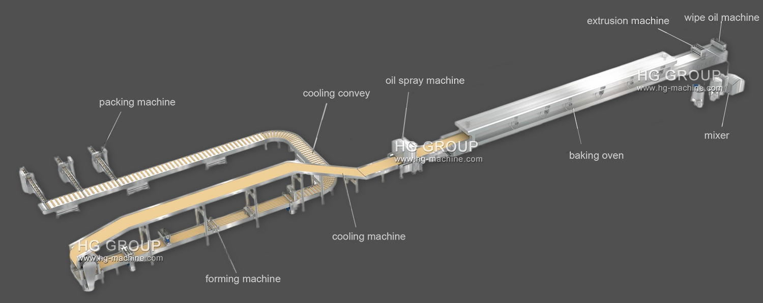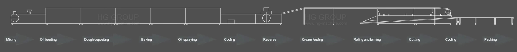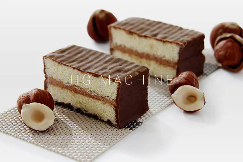 工作原理:首先,将浆料沉积在钢带上烘烤。然后,在蛋糕上喷油并翻转。接下来,机器将纵向切割蛋糕并在每条线上涂上奶油。然后,翻转线并按下到下一行,然后水平切割长蛋糕。在此过程中,您可以决定您想要的蛋糕有多长。最后,您可以获得瑞士卷或分层蛋糕。