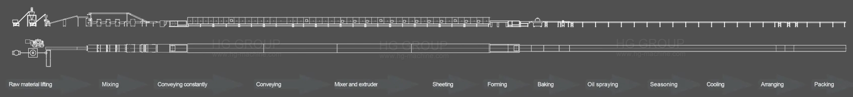 主要设备:V型搅拌机、锥形搅拌机、搅拌挤出机、升降输送机、3台板材机、成型机、废物回收机、烤箱、喷油机、滤油机、调味机、堆垛冷却输送机。
