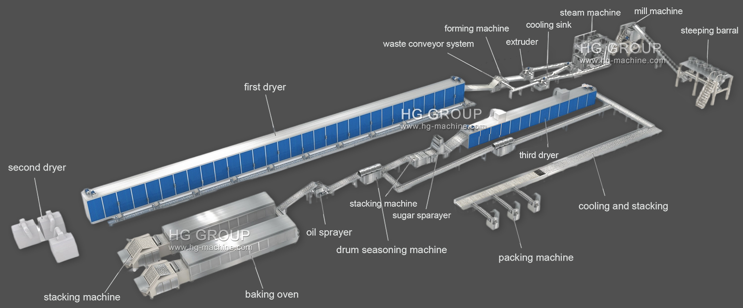 该全自动雪米饼干生产线采用来自日本和台湾的先进雪米饼干加工机械。在保留核心生产原则的同时,针对中国水稻品种的具体特点和大规模生产的需求进行了优化。整个生产线由四个部分组成:铣削、成型、膨化、调味和包装。作为国内经验丰富的大米加工设备制造商,该设备性能高效稳定、产量高、投资成本低,已成为开发雪米饼干产品的食品公司的首选。